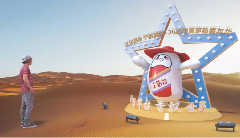 本次寧夏茅粉嘉年華以星空和沙漠為橋梁,深度融合了茅臺文化與寧夏文化,在主KV設(shè)計上選用了藍(lán)天、沙漠、星空為背景,茅臺酒瓶佇立在畫面中間,酒瓶中是寧夏地標(biāo)建筑元素。大漠黃沙,浩瀚星空,充滿了沙漠風(fēng)情,展現(xiàn)了茅臺飄香寧夏大地。