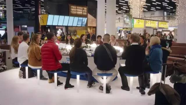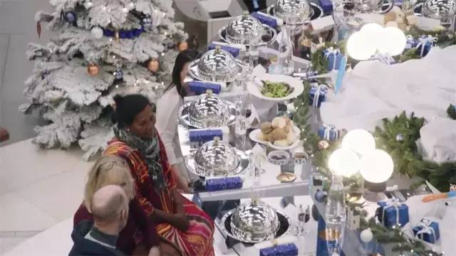 為寂寞的環(huán)球旅行者提供了一頓“友誼大餐”。它在一個大圓桌上擺滿了美味的圣誕晚餐,并免費提供。這張大餐桌在空中4.5米處,為了讓它能降下來,桌子周圍的20張凳子必須被坐滿。人們開始相互邀請共同參與,成功地降低了餐桌的高度,開始享用美食盛宴。
