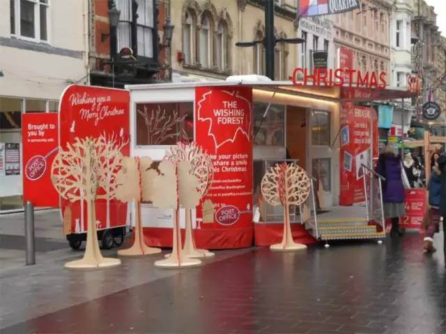 邀請人們在“許愿森林”里許愿,吸引了他們的參與。顧客可以在車內(nèi)的數(shù)字售貨機上購買圣誕郵票,并使用眼鏡、圣誕帽和木制動物等道具創(chuàng)造出“微笑者”——個性化的圣誕郵票。