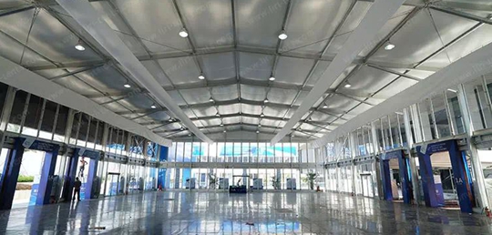 篷房斜梁與橫梁角度為7度,篷檐垂邊Banner廣告位,為客戶提供更好的平面廣告平臺。此次的藍(lán)色底色的廣告位非常引人注目,形成了一道亮麗的風(fēng)景線。篷房內(nèi)部配備了篷房專用空調(diào),與篷房完美適配,配合進(jìn)出口處玻璃門風(fēng)幕簾機(jī),讓舒適的空調(diào)冷風(fēng)遍布展館內(nèi)各個角落,保持室內(nèi)空氣的清新與舒適。