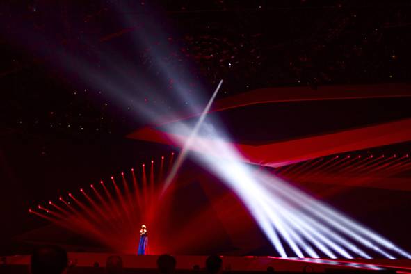 在演出中大量使用光束燈作為特效燈具的方式,在2011年歐洲歌唱大賽已經(jīng)成功運(yùn)用。而2012年的表現(xiàn)則更上一層樓,此次舞臺(tái)上使用的影像占用的空間更大了,為了配合這種被壓縮了的舞臺(tái)空間,光束燈被安插在LED大屏幕的邊界處。演出近1/3的電腦燈是光束類燈具,這要求燈光與視頻裝置密切配合才能避免燈位被大屏遮擋。共3 000臺(tái)燈具被壓縮在這么小的區(qū)域內(nèi),不論是控制還是燈位安裝都相當(dāng)棘手,但燈光和視頻同樣精彩才能確保40多個(gè)國(guó)家的選手上臺(tái)各自具備鮮明的特色和獨(dú)特的燈光變化。而舞美除了個(gè)別的場(chǎng)景外,基本沒有什么變化,于是必須依托視頻和燈光來區(qū)分每個(gè)歌手的風(fēng)格。據(jù)說,控制編程共有4 000多個(gè)CUE(絕大部分都是光束變化的程序)和近百個(gè)預(yù)置。在7個(gè)小時(shí)的超長(zhǎng)演出中,這些設(shè)計(jì)的變化相當(dāng)豐富。。其實(shí),3 000臺(tái)燈具能被電視畫面經(jīng)常捕捉到的只是布光中很少的一部分。從燈位圖中看,舞臺(tái)的上空只有不到1 000臺(tái)燈。在現(xiàn)場(chǎng)照片中看到的主要為Beam燈和Sharpy燈具,正中的3個(gè)可動(dòng)同心圓環(huán)上也布置了大量的Beam燈具。如圖2顯示了帶顏色的Sharpy燈具和白光1 500 W Beam的撞色搭配效果,歌手的逆光也由1 500 W Beam完成(此時(shí)斷開電機(jī),工作人員采用手柄控制的1臺(tái)1 500 W Beam燈具完成)。