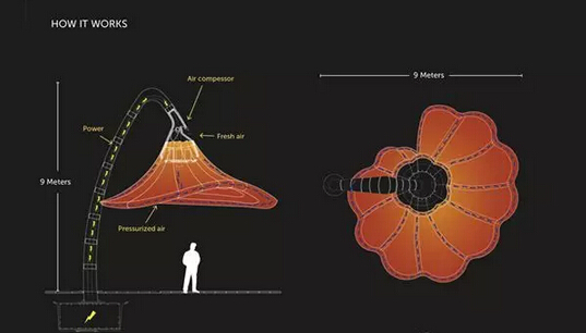 四個(gè)高 30 英尺的路燈,像是血紅的罌粟花朵,從城市任何角度觀(guān)望都很醒目 。地下是路燈的供電系統(tǒng),通過(guò)粗大的「花枝」給「花萼」處的風(fēng)泵和照明系統(tǒng)供電,空氣從風(fēng)泵口吸入,進(jìn)入花朵中膨脹開(kāi)來(lái)。這些巨型路燈能夠感應(yīng)到行人,當(dāng)有行人經(jīng)過(guò)或駐足時(shí),花朵底部的空氣流會(huì)變化,花朵便會(huì)自動(dòng)充氣開(kāi)放,行人走開(kāi),便會(huì)自動(dòng)放氣合上。當(dāng)電車(chē)即將到站時(shí),便會(huì)打開(kāi)等待下車(chē)的乘客。夏天,這里將是一個(gè)很好的遮陽(yáng)棚;雨天可以避雨。